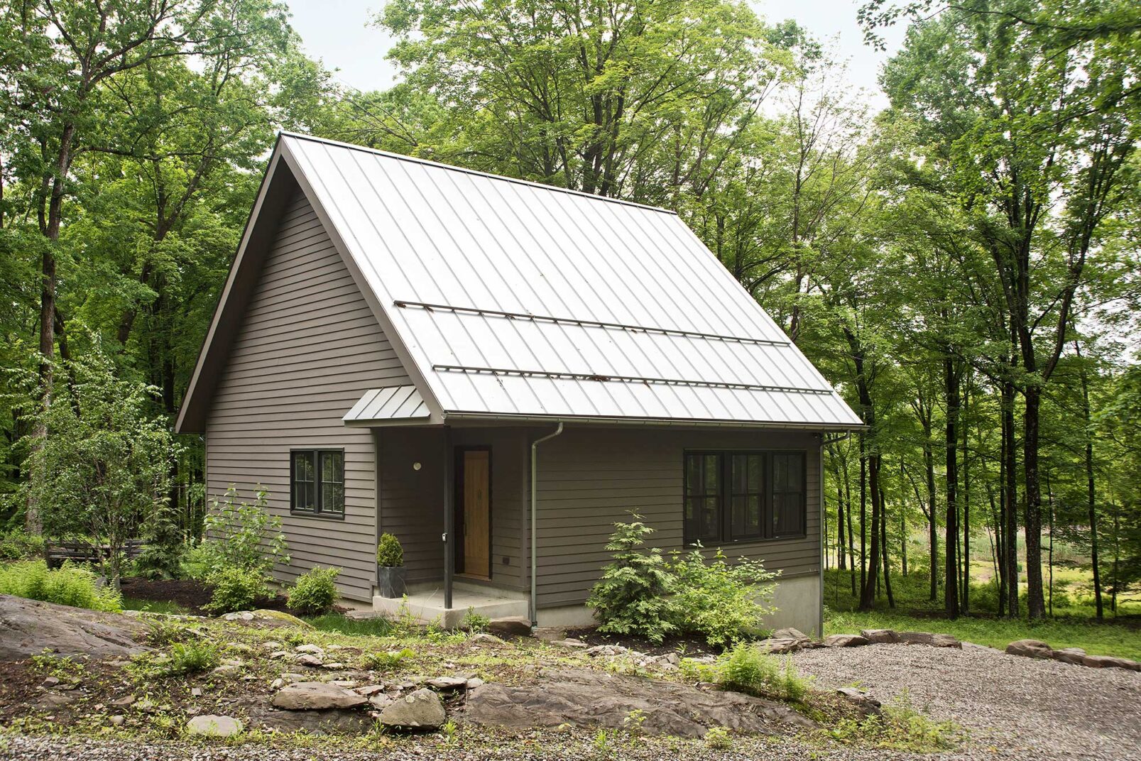 The owners bought the 15-acre parcel with the intention of building a 4000 square foot main house and a 900 square foot guest cottage, but decided to build the guest cottage first so as to shorten the timeline before they could start enjoying their property. This created an interesting design challenge: to master plan the entire site and build the infrastructure for the whole property. This involved determining the best site for the (yet non-existent) main house and then determining a secondary site suitable for the guest cottage and then putting in a driveway, electric service, a well, a buried 1000-gallon propane tank and generator to serve both buildings. Careful attention was paid to keeping the guest cottage subordinate to the main house. Lasers were used to ensure the front door of the guest cottage was lower than that of the main house and to determine how to put parking behind a rock outcropping so as to hide cars from view. A complex soil and fill plan was implemented to use excess soil produced by the septic field to fill in a swale near the guest cottage so as to avoid costly carting of soil off the property.