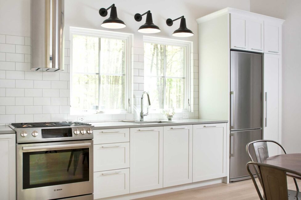 As for the cottage itself, code requires that an “detached accessory dwelling” be no bigger than 900 square feet. But since the family of four planned on living in the guest cottage for as long as two years before the main house was done, there was an importance to create a the greatest feeling of space possible. Though only on a 30-foot square footprint, the steep roof creates a 25-foot cathedral ceiling that gives a feeling of vastness. An austere front facade was designed for maximum privacy from the main house and huge bays of windows facing the back give the house an openness and airiness that is not expected as you walk through the solid ash front door. To make the space seem bigger and brighter, interiors are largely monochromatic, with white walls, trim, tile and cabinetry and a whitewashed oak floor. Exposed wood collar ties, an ash front door and a leather bench make for the subtlest splashes of color in the white space.