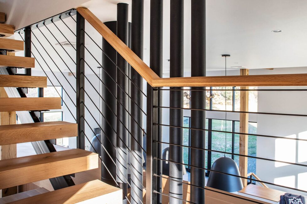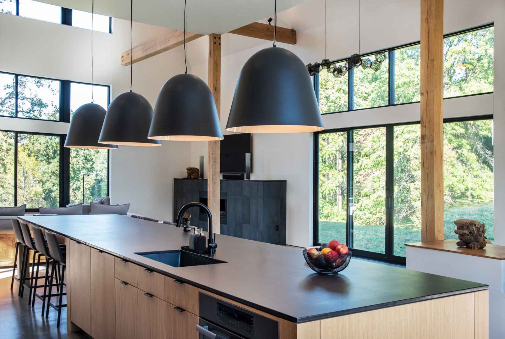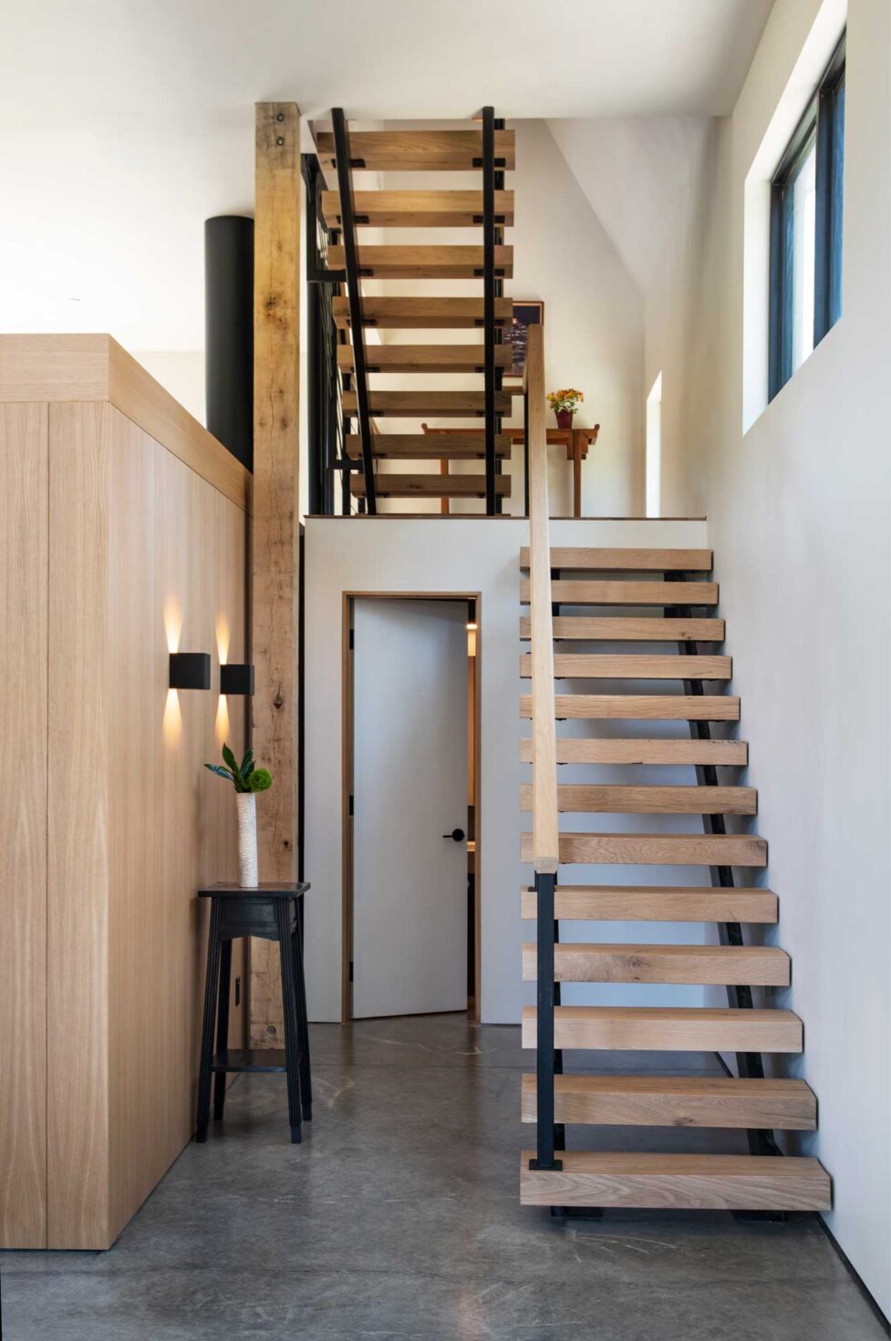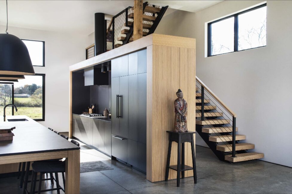 The design motif was bold and simple: to have a minimalist black kitchen, softened by a white oak millwork. The massive 20-foot island has a porcelain countertop. The stairs are conceived of as a sculptural element that combines the industrial look of black metal stringers and banisters with the earthy elements of huge white oak slab steps.