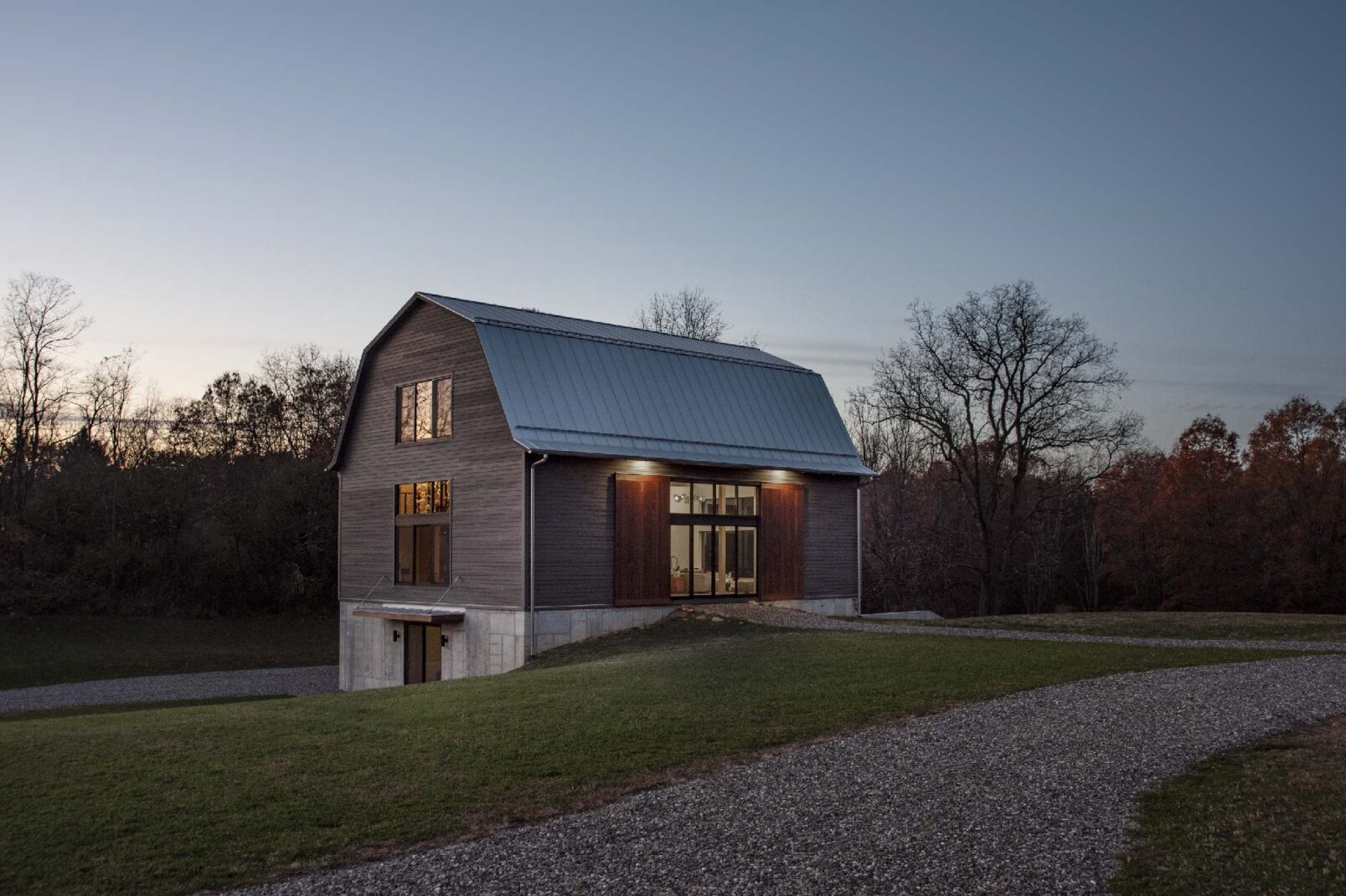 The project started with an early 20th Century red dairy barn in the middle of a field. The original house had burned down long ago, but the new owners loved the iconic shape of the gambrel roof and wanted convert the building into bold modern house. It was soon learned that the structure was too flimsy, and that it would be more cost effective to tear it down rather than renovate. The original structure was painstakingly surveyed so that an exact replica could be built in the exact same location.