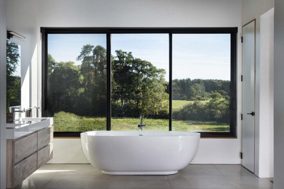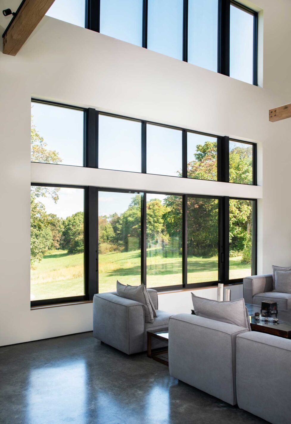 A central design concept was to keep it looking like a barn, with its austere and monolithic form. To achieve this look, only one window penetration was put in the front (flanked by massive ipe wood barn doors) and two on the sides. The windows were few but huge–and this both allowed the building to be more pure, but also disguised its impressive scale.